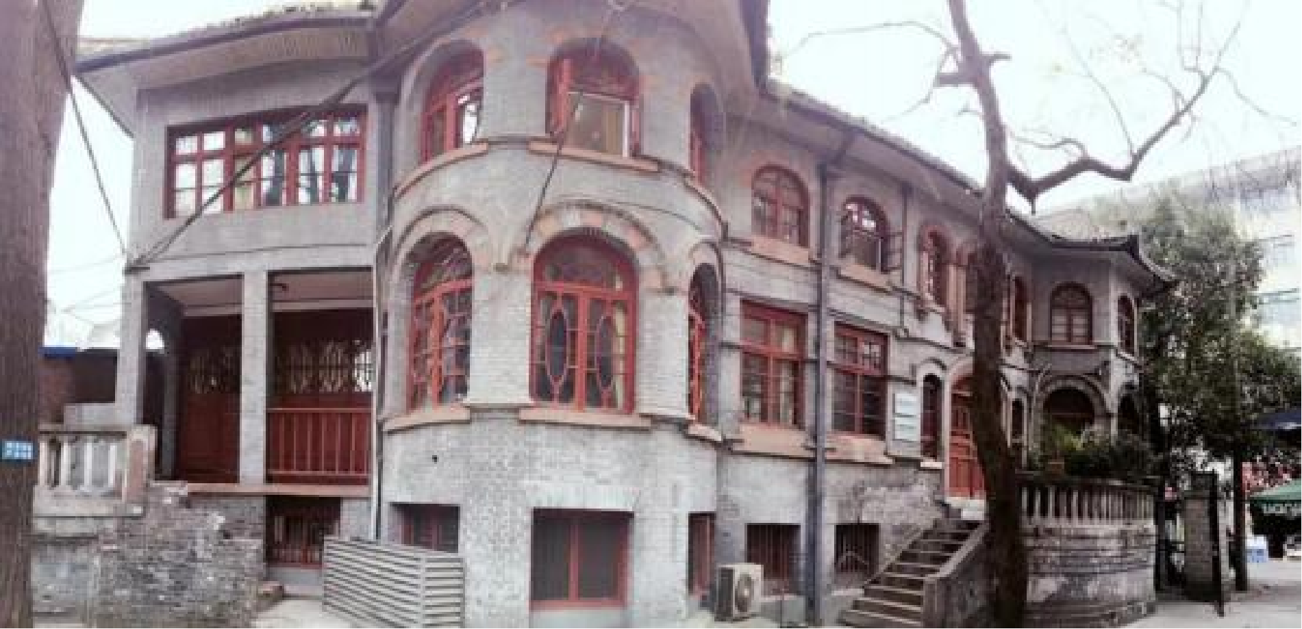 这栋别具风情的洋楼,底部巧妙设计了半层地下室。它既以灰色砖墙、红木窗框和灵动飞檐传递着东方神韵,又以圆拱形大门与西洋彩色玻璃窗展现异域风情,成为城市中心弥足珍贵的历史切片。